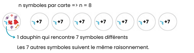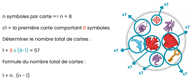Les élèves devront trouver une équation qui permet de relier les informations constatées. Par la suite, cette formule mathématique permettra de généraliser les recherches « Et pour 4 symboles par cartes ?, pour n symboles par cartes ? combien de symboles différents utiliser, combien de cartes créées, combien de fois apparait chaque symbole ? … »