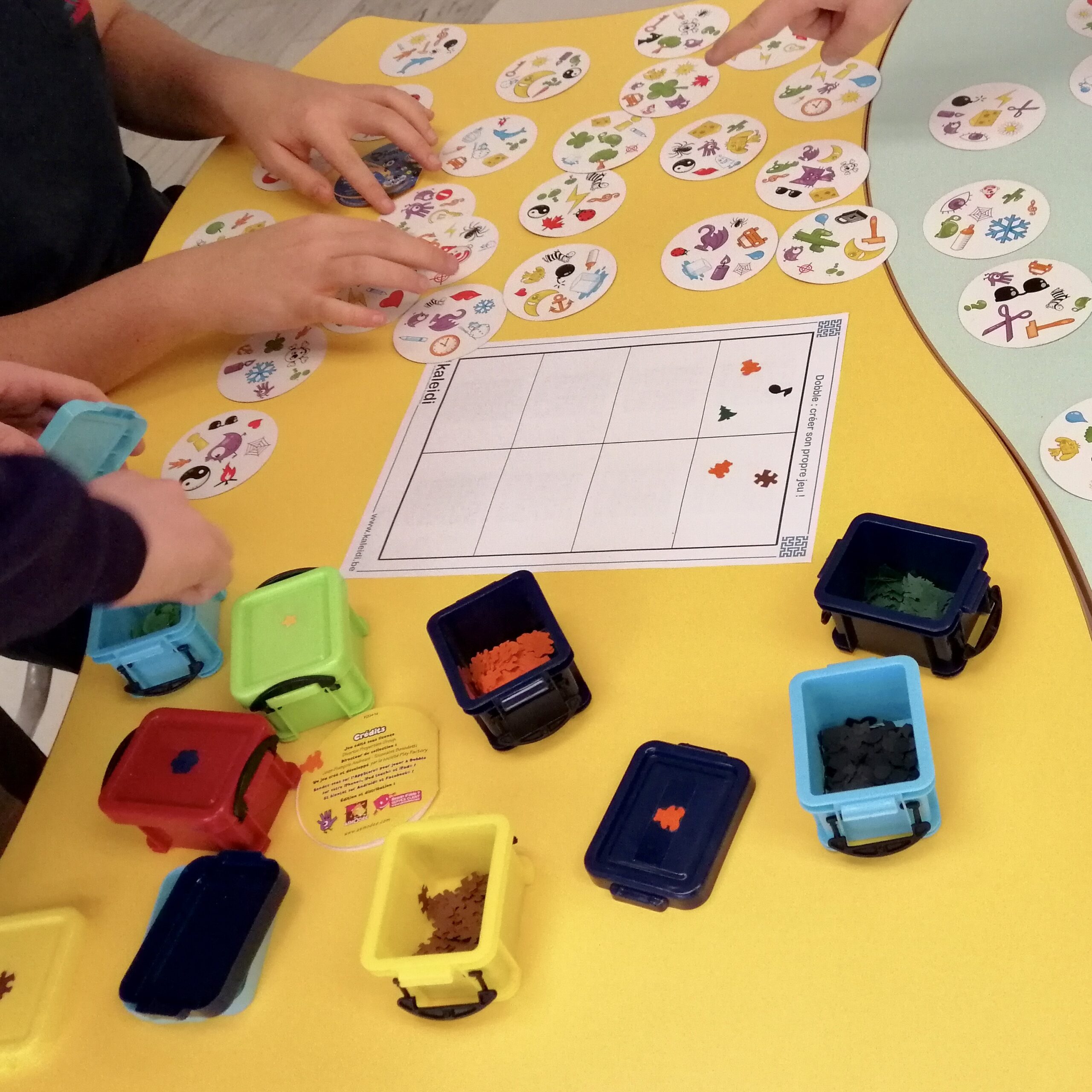 Ensuite, ils complètent le tableau à double entrée en croisant les cartes (sur les lignes) avec les symboles (sur les colonnes) afin de reconstituer de manière logique ce jeu.
