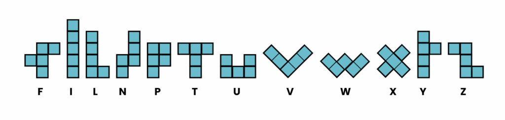 Les pentaminos sont décrits dès 1907 par Henry Ernest Dudeney, compositeur et créateur de casse-têtes mathématiques, mais c’est Salomon Golomb qui eut l’idée de leur attribuer une lettre de l’alphabet pour les nommer :