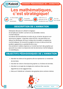 En utilisant les graphes et en les comprenant, les élèves pourront visualiser l’ensemble de tous les cas possibles lorsqu’on joue à un jeu de stratégies. Les graphes sont également la base de toute analyse de données dans le monde informatique. Un temps sera donné pour faire le lien entre la notion de stratégie et la notion d’algorithme.